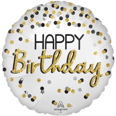 Круглый фольгированный шар с надписью Happy Birthday в золотой рамке на белоом фоне. При надувании рекомендуется использовать гелий. Имеет встроенный клапан - что упрощает надувание. Тонкая миларовая (фольга на полиэтиленовой основе) пленка позволяет шарам не сдуваться от недели до одного месяца. Товар продается в индивидуальной упаковке с цветным изображением шара.
